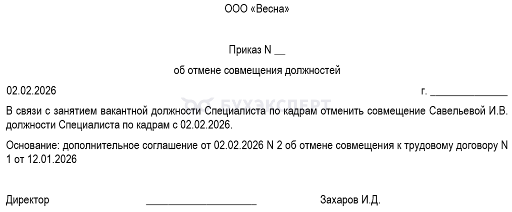 Сотрудник совмещал вакантную должность. В случае ее занятия постоянным сотрудником, оформляется доп. соглашение и приказ об отмене совмещения, например приказ такого вида.