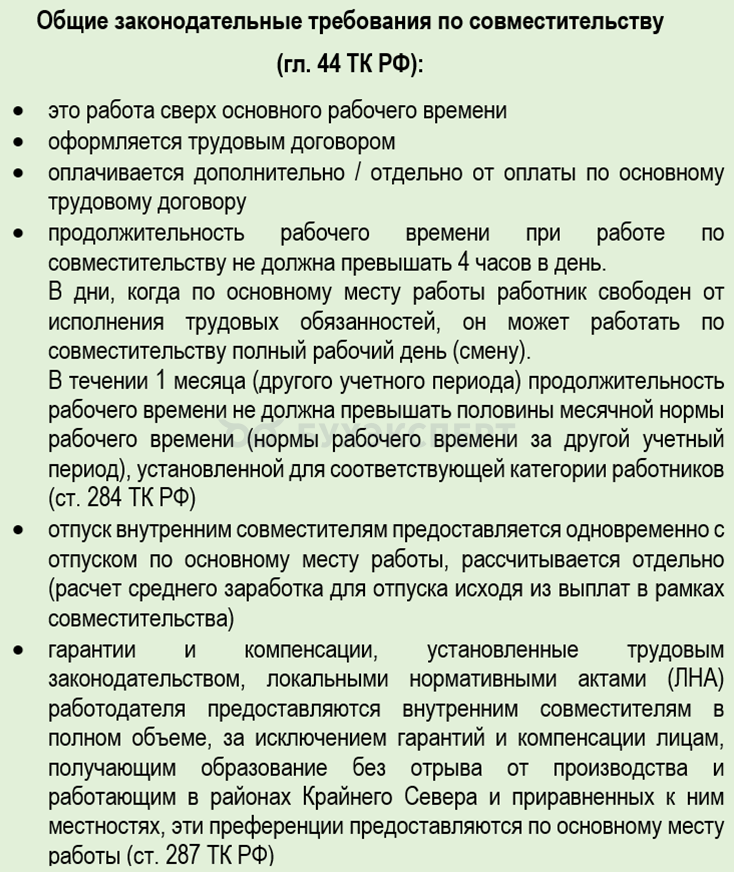 Дополнительные условия по внутреннему совместительству могут быть установлены нормативно-правовыми актами (НПА) для отдельных категорий работников (например, для педагогов, медиков и т.п.).