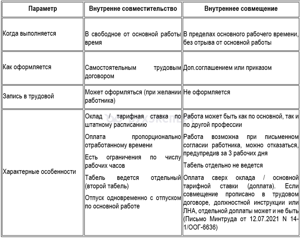 Внутреннее совместительство и внутреннее совмещение — не одно и то же, хотя есть у этих понятий общие черты: