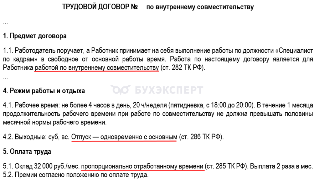 - Оформляется отдельным трудовым договором, в котором прописывается в обязательном порядке, что это работа по совместительству, устанавливается режим труда и отдыха, оговаривается оплата труда