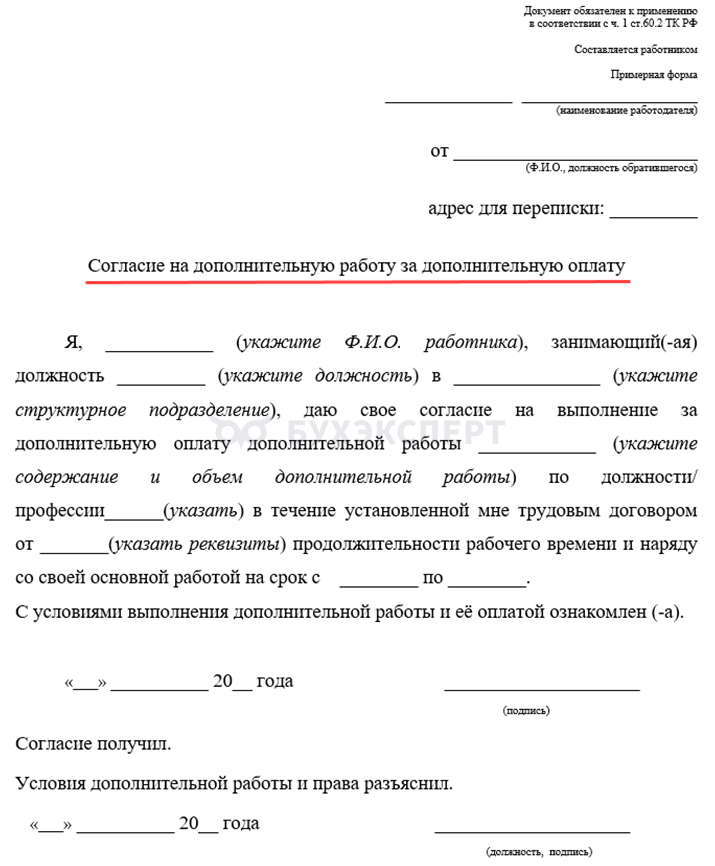 - По ст. 60.2 ТК РФ при совмещении профессий (должностей) требуется оформление письменного согласия работника на дополнительную работу