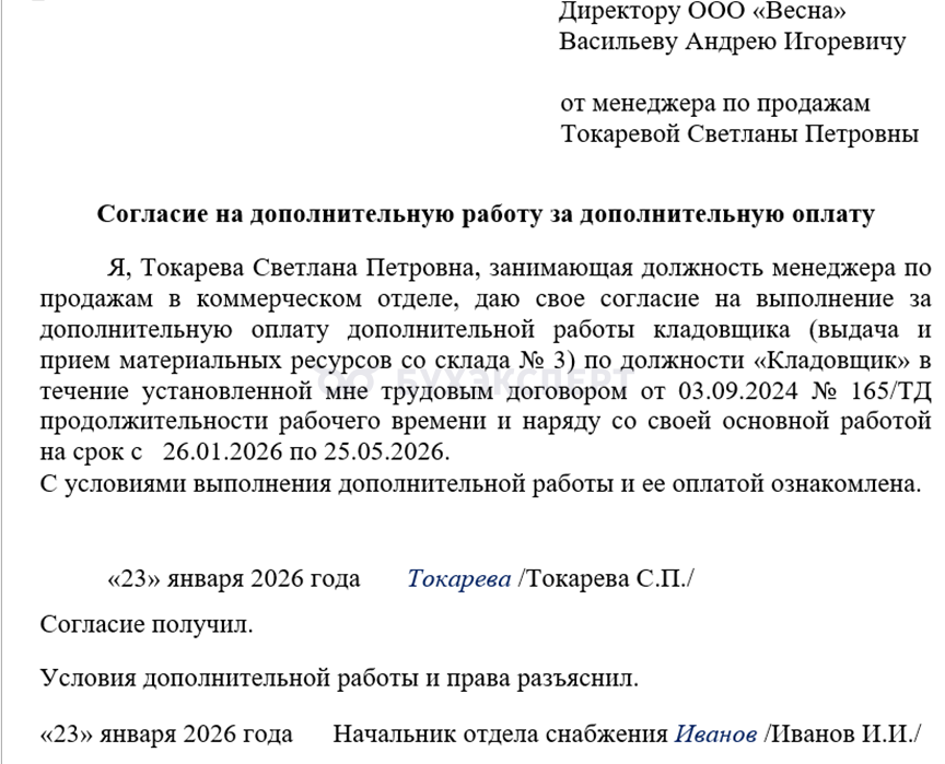 - Законодательно не установлено, как оформить такое согласие — в форме заявления, проставлением работником подписи на предложении работодателя о совмещении, составлением согласия по шаблону трудового ведомства или иным способом