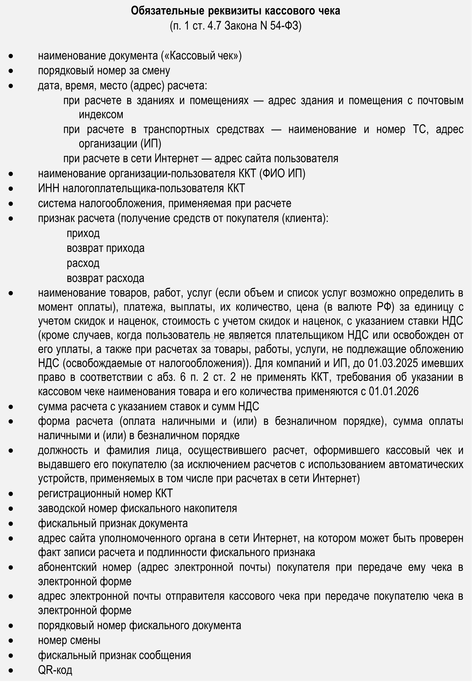 С 01.09.2025 введены дополнительные реквизиты кассового чека (Приказ ФНС от 26.03.2025 N ЕД-7-20/236).