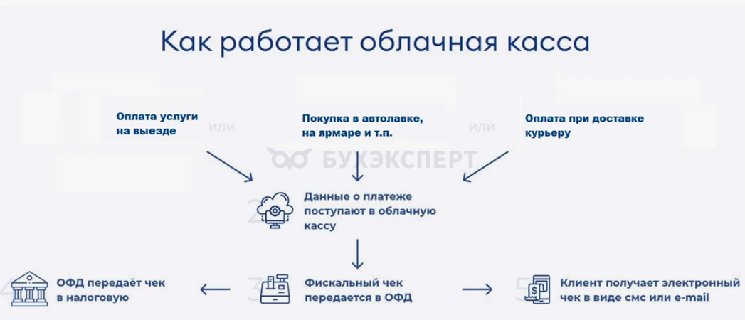 Принцип функционирования: после проведения финансовой операции на сайте данные об оплате транслируются в сервис виртуальной кассы, где генерируется фискальный документ с последующей отправкой: