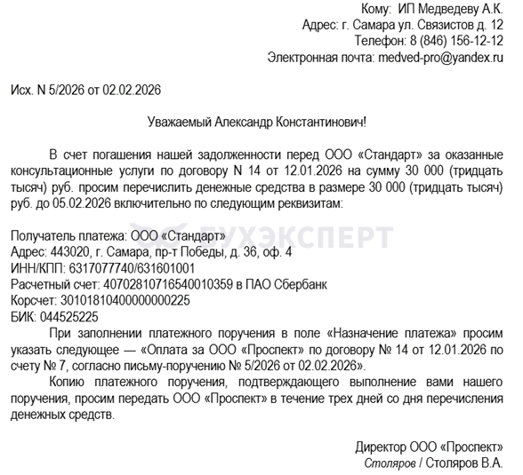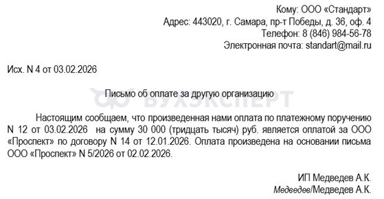 Используем условия предыдущего примера. ИП Медведев А.К. заплатил кредитору компании ООО «Проспект» 30 000 руб. за консультационные услуги, оказанные по договору N 14 от 12.01.2026. Затем информировал получателя денег отдельным письмом.