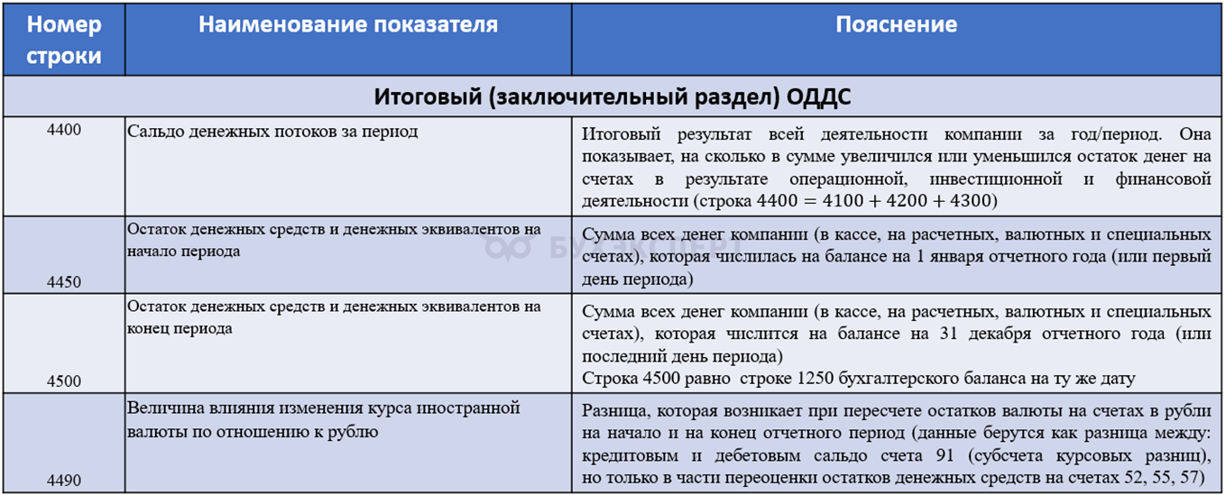 В последнем разделе ОДДС отражается расчет итогового сальдо, включающего суммарный результат потоков от операционной, инвестиционной и финансовой деятельности, корректировку на величину курсовых разниц от пересчета валютных остатков, а также сопоставление остатков денежных средств и эквивалентов на начало и конец отчетного периода, значение которых должно соответствовать данным одноименной строки бухгалтерского баланса.