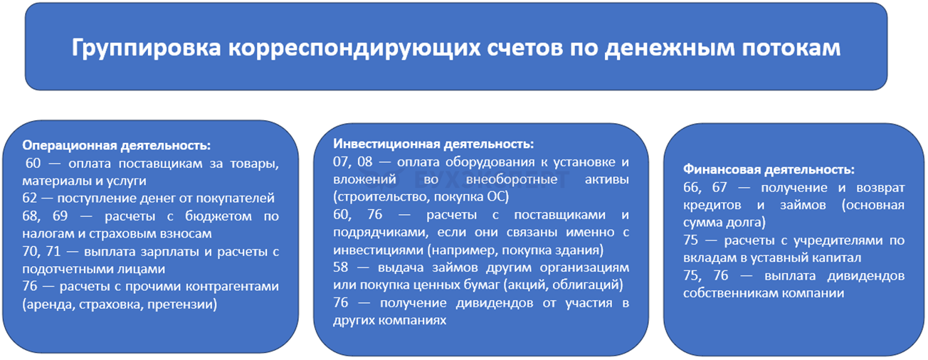 - Собирается информация об оборотах по счетам 50 «Касса», 51 «Расчетные счета», 52 «Валютные счета», 55 «Специальные счета» и 57 «Переводы в пути», 58 «Финансовые вложения» в корреспонденции со всеми счетами бухучета, которые раскрывают экономическое содержание поступлений и выплат — смотрим не на факт движения денег, а на то, за что заплачены или от кого получены средства (покупатели, поставщики, сотрудники, бюджет, банк и т.д.). Это могут быть счета: 07, 08, 60, 62, 66, 67, 68, 69, 70, 71, 75, 76