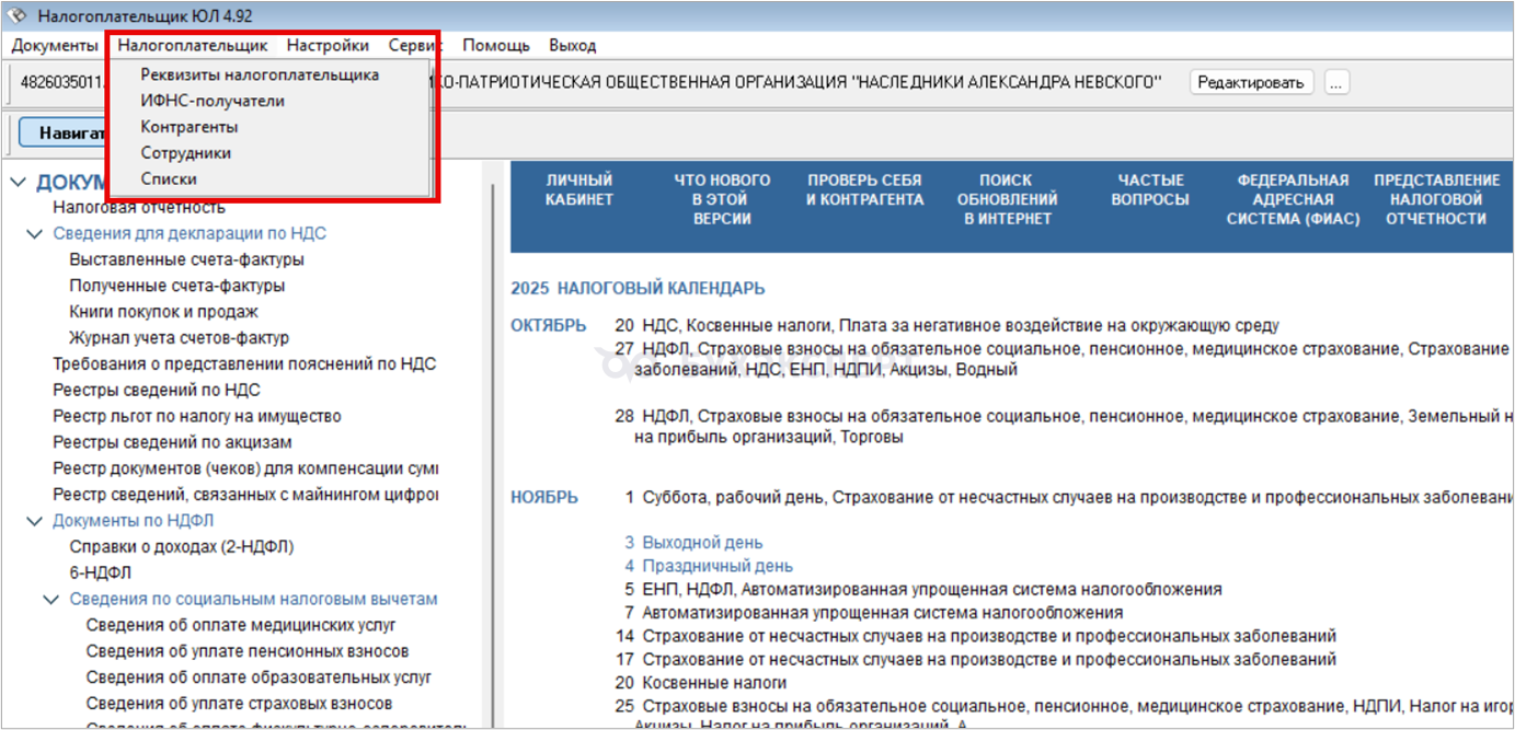 • перейдите на портале ФНС в Раздел Программные средства, выберите подраздел Налогоплательщик ЮЛ и инсталлируйте приложение, следуя инструкциям мастера установки. Прежде чем приступить к использованию программы, внесите сведения о вашей организации