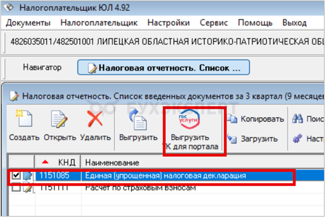 • программа Налогоплательщик ЮЛ дает возможность формировать отчеты в установленном XML — формате. Создайте отчет и выполните выгрузку транспортного контейнера ТК для его последующей отправки через портал