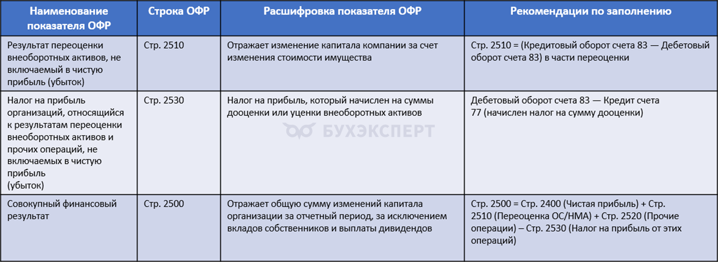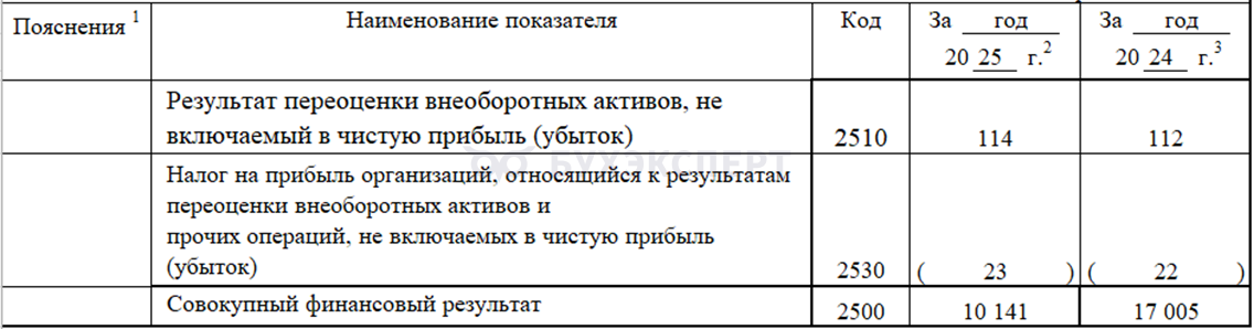 - Четвертый блок включает строки 2510, 2530, 2500), где отражается переоценка активов, не влияющая на чистую прибыль.