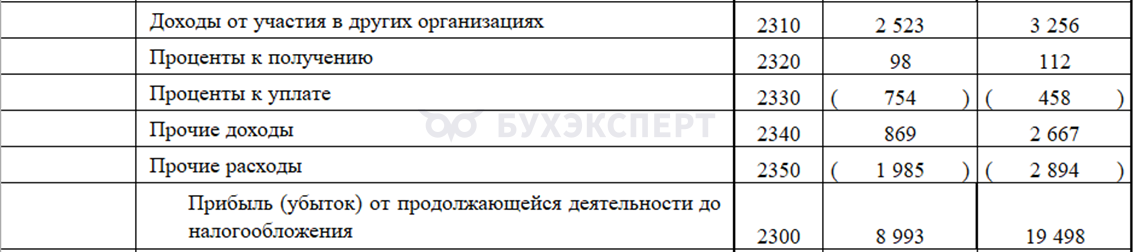 - Финансово-инвестиционный блок состоит из значений: доходы от участия и проценты (стр. 2310, 2320, 2330), прочие доходы и расходы (стр. 2340, 2350), прибыль (убыток) до налогообложения (стр. 2300).