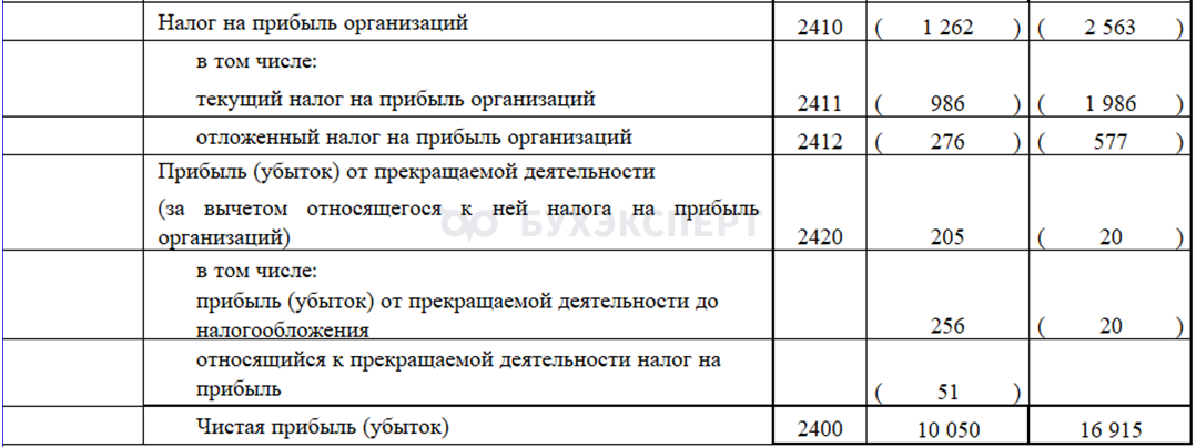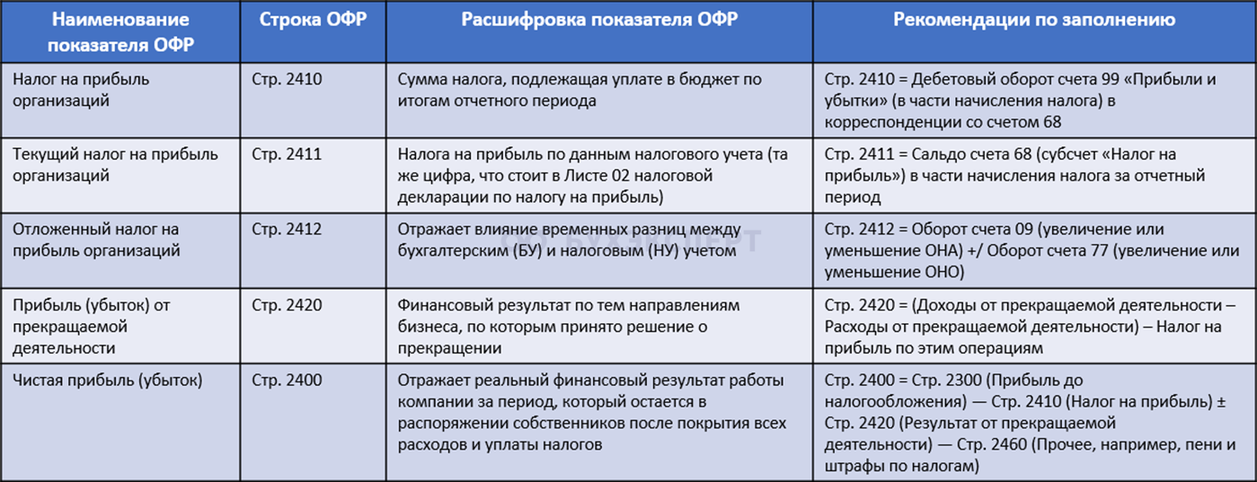 - Налоговый и итоговый блок состоит из значений: налог на прибыль (стр. 2410, 2411, 2412), чистая прибыль (убыток) (стр. 2400).