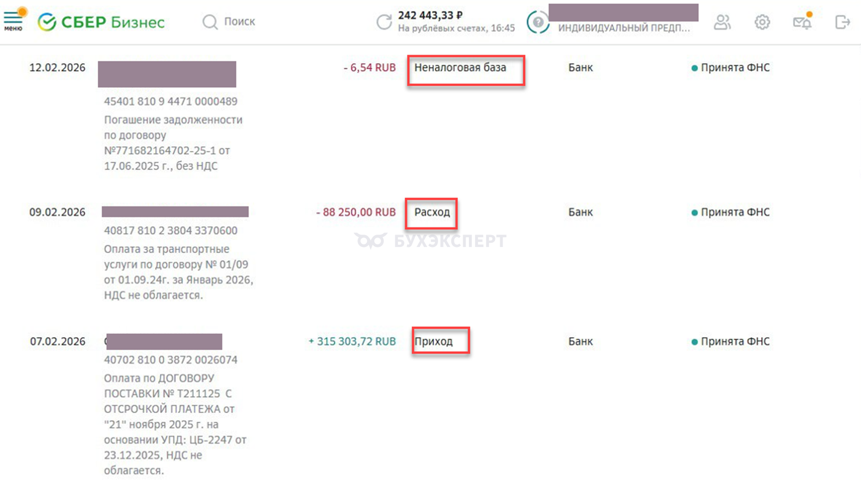 - не налоговая база (ННБ) — движения, которые не влияют на налог (переводы между своими счетами, возврат займов, уплата налогов, личные переводы собственника)