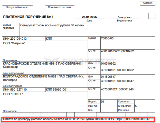 Специальные маркеры в назначении платежа помогают банку применить нужную разметку по методическим рекомендациям ФНС и уменьшают риск некорректного учета операции при расчете налога по АУСН. Эти коды указываются в платежном поручении самим плательщиком (в том числе плательщиком на АУСН) в поле 24 «Назначение платежа» и имеют приоритет для банка при определении признака операции. О банковских операциях по учету расходов на АУСН в 1С можно прочитать здесь.