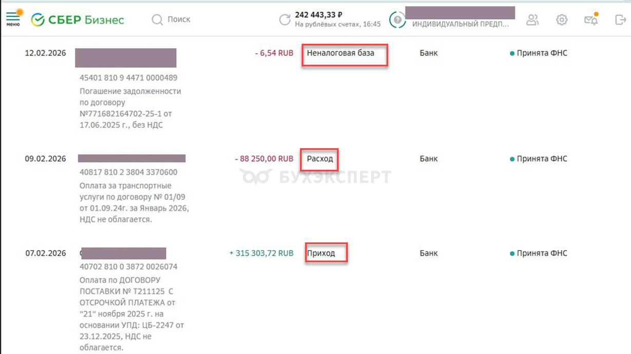 - не налоговая база (ННБ) — движения, которые не влияют на налог (переводы между своими счетами, возврат займов, уплата налогов, личные переводы собственника и др.)