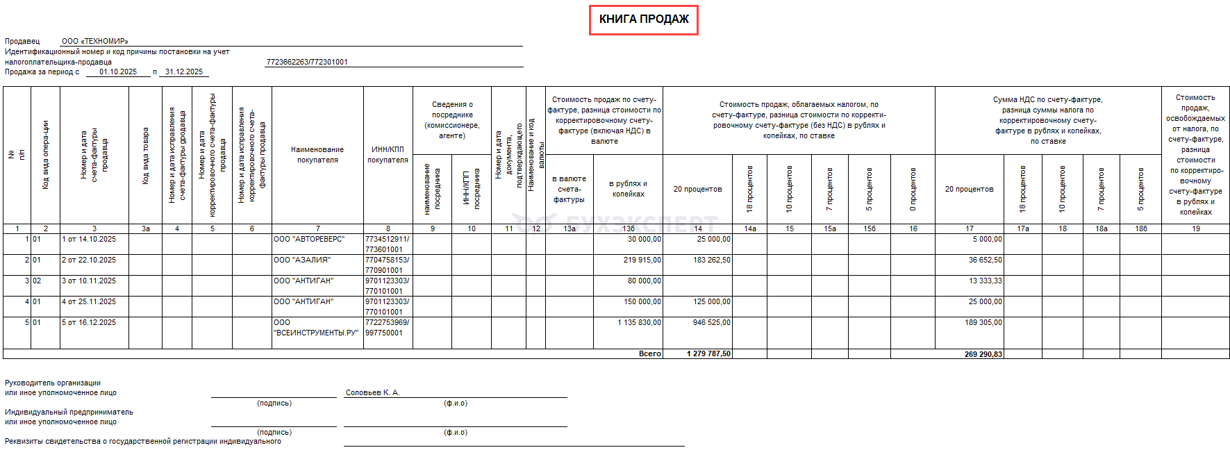 В книге продаж компании ООО «ТЕХНОМИР» за 4 квартал 2025 года содержится 5 записей: