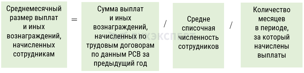 - Среднемесячную зарплату рассчитывают путем деления суммарных выплат физлицам по данным РСВ, с которыми заключены трудовые договоры, на среднесписочную численность работников и количество месяцев расчетного периода