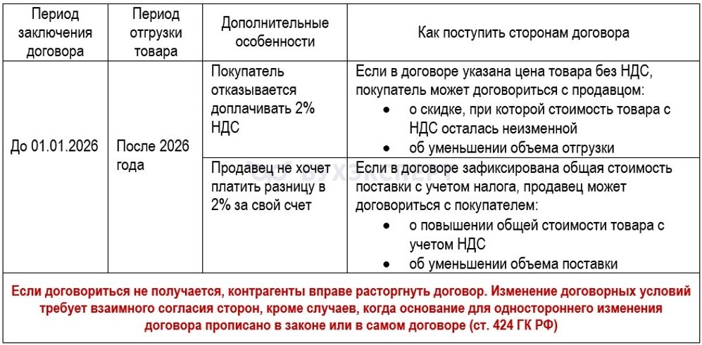 Если покупатель готов с 01.01.2026 уплачивать в цене поставки дополнительные 2% НДС, спокойно перейти на новые условия получится только в одном случае: если в 2025 завершены оплаты и поставки по договору без переходящих остатков.