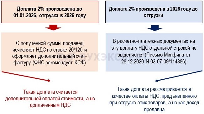 Если покупатель оплатил стоимость по договору в 2025 году, а реализации товара произошла в 2026 году, то после отгрузки покупателю придется доплатить продавцу 2% НДС (сумму, на которую выросла ставка налога: 100 000 руб. х 2% = 2 000 руб.).