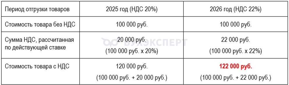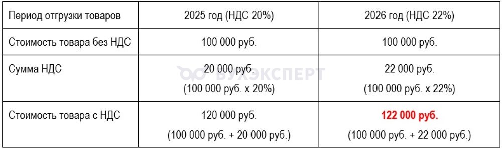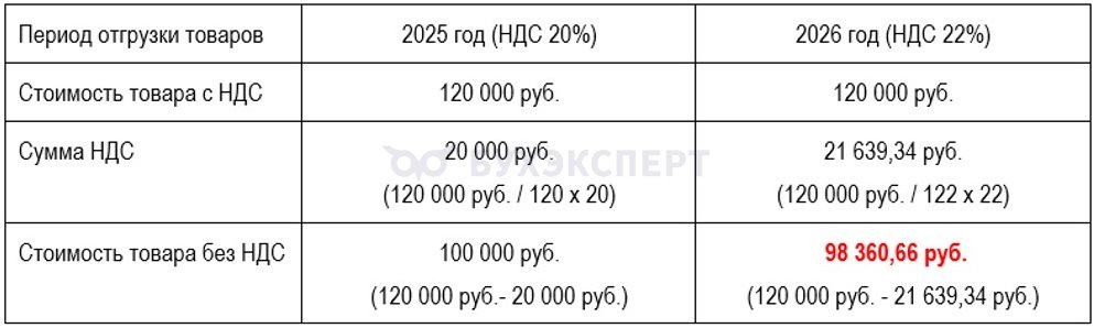 В этом случае при реализации товаров после 01.01.2026 продавец обязан исчислить налог по ставке 22%, то есть предъявить покупателю сумму не 120 000 руб. (включая налог), а 122 000 руб.