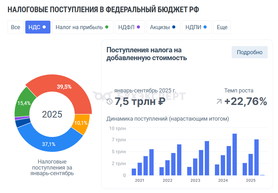 По данным ФНС, за январь-сентябрь 2025 года из 19,1 трлн руб. налоговых поступлений в федеральный бюджет на долю НДС приходится 7,5 трлн руб.: