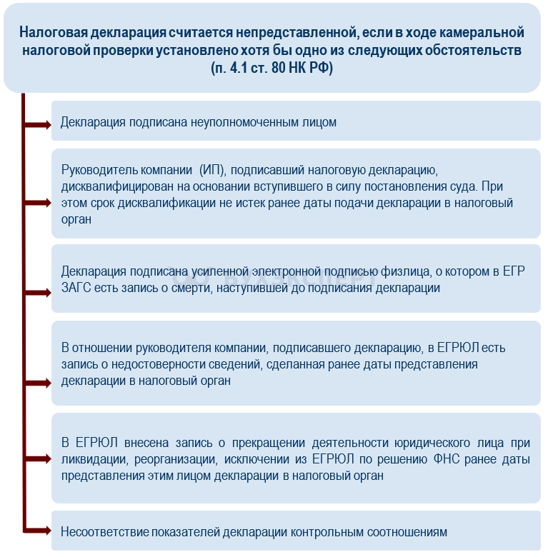 Своевременная отправка декларации не гарантирует, что отчетность примут. В ряде случаев ее признают непредставленной (п. 4.1 ст. 80 НК РФ).