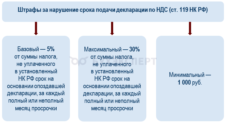 За опоздание с отправкой нулевой НДС-декларации придется уплатить минимальный штраф — 1 000 рублей. Такой же штраф назначат при опоздании с декларацией, если нет просрочки по уплате налога или по итогам расчета штраф окажется меньше 1 000 рублей.