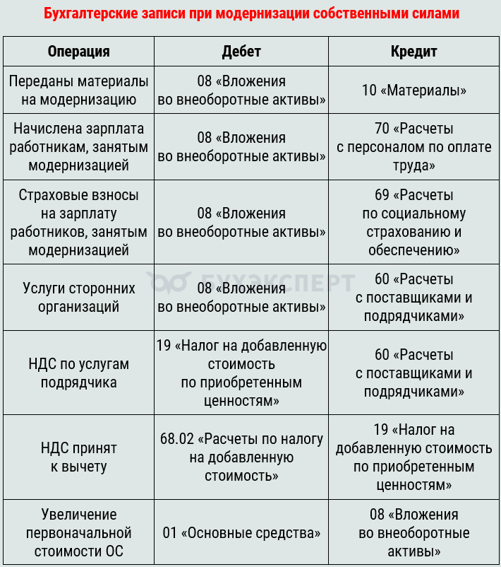 Бухгалтерские проводки при модернизации ОС собственными силами.