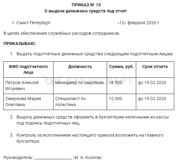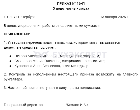 В организациях может использоваться приказ со списком подотчетных лиц. В таком документе перечисляют физлиц, которым разрешено получать деньги под отчет. Однако этот приказ не заменяет заявление на выдачу подотчетных средств. Он лишь определяет круг возможных подотчетников, но не является основанием для выдачи конкретной суммы.