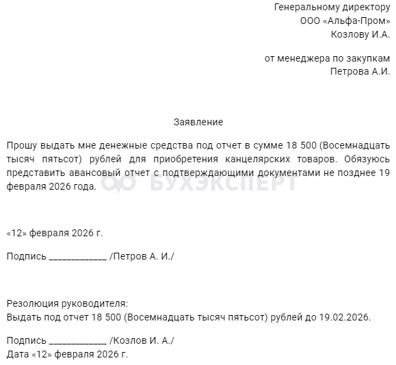 Документ составляется от имени подотчетника — того, кто непосредственно будет использовать деньги.