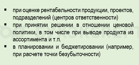 Имея данные о переменных затратах, легче определять рентабельность выпуска того или иного товара, анализировать величину материальных затрат на производство, регулировать объем производства.