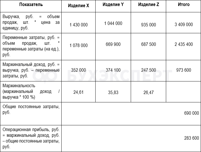 - Производство изделия X наименее выгодно (низкая маржинальность). Возможно, следует уменьшить объем производства либо изыскать способы снижения переменных затрат на это изделие