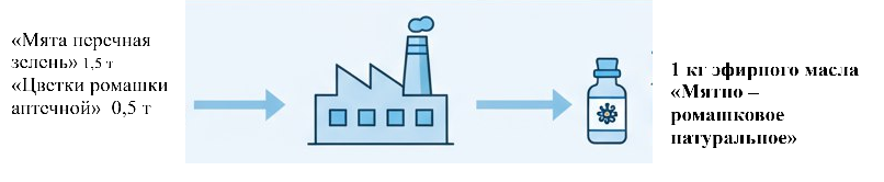 Согласно учетной политике, материалы списываются в производство по средней себестоимости. В соответствии с Техническим регламентом для получения 1 кг эфирного масла «Мятно–ромашковое натуральное» необходимо оформить отпуск в производство сырья «Мята перечная (зелень)» 1,5 т и «Цветки ромашки аптечной» 0,5 т.
