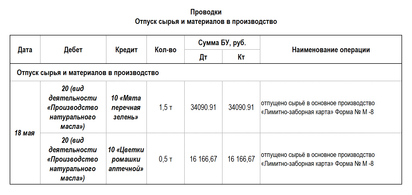 18 мая бухгалтер отразил в учете операцию по отпуску сырья на производство 1 кг эфирного масла «Мятно –ромашковое натуральное»: