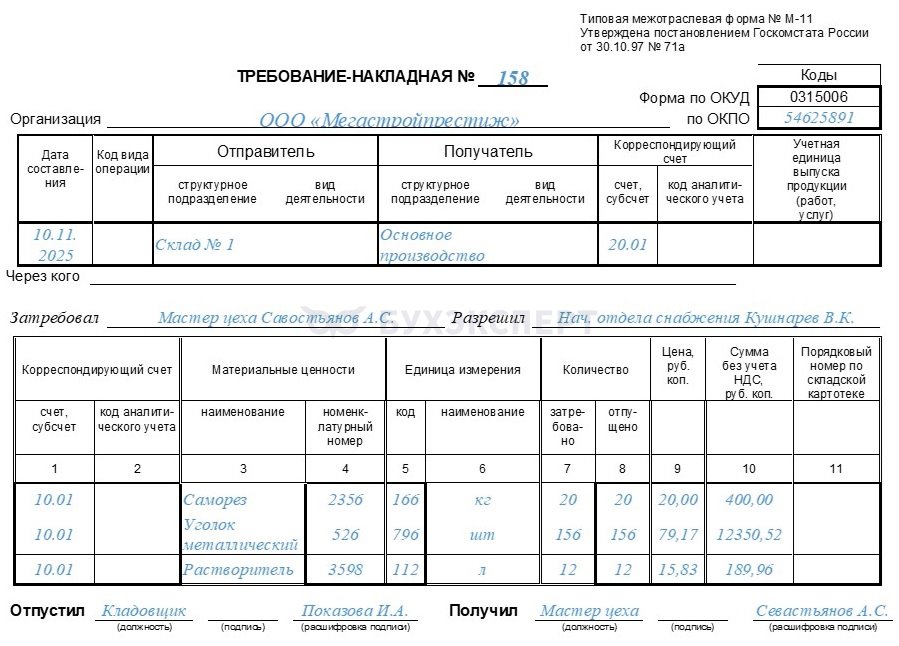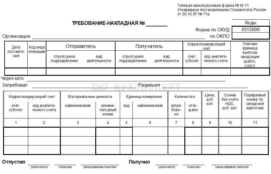 Требование-накладная формы М-11 служит для оформления внутреннего перемещения материально-производственных запасов (МПЗ) в пределах одной организации.