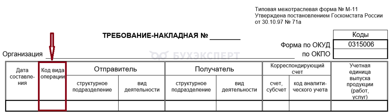 Строка Код вида операции расположена в первой таблице формы М‑11.