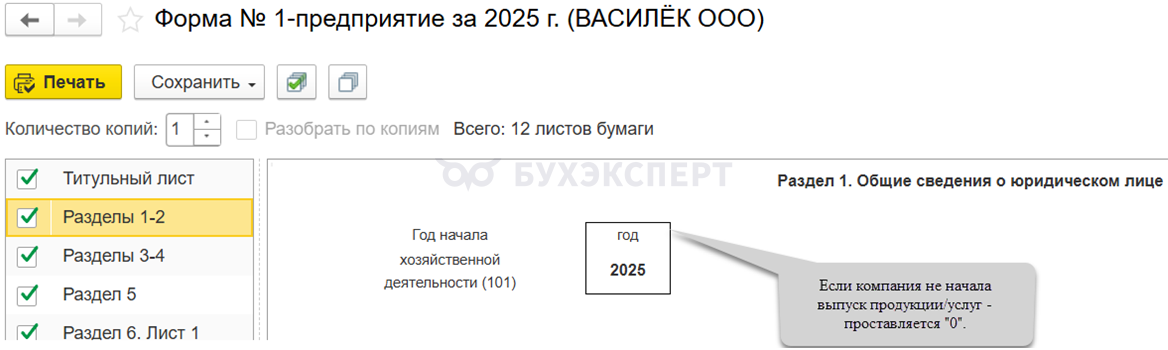 ООО «Альфа» зарегистрировано 15.03.2025, но первый договор выполнило только в декабре 2025 года. В строке 101 указываем «2025». Если бы компания не начала выпуск продукции/услуг — проставили бы «0».