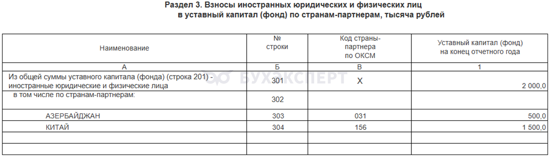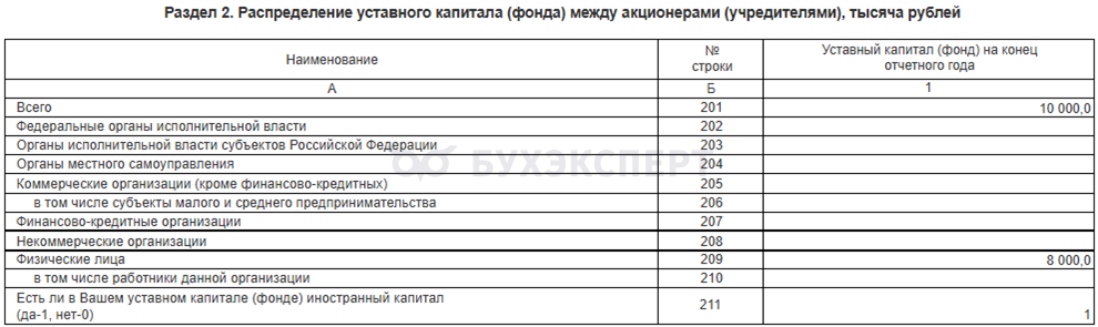 У ООО «Бета» уставный капитал — 10 000 тыс. руб., из них 8 000 тыс. руб. принадлежит российским физическим лицам (стр. 209), 2 000 тыс. руб. — иностранным компаниям (стр. 211 = «1», далее заполняется Раздел 3, стр. 301 = 2 000, стр. 302 — название страны-партнера).