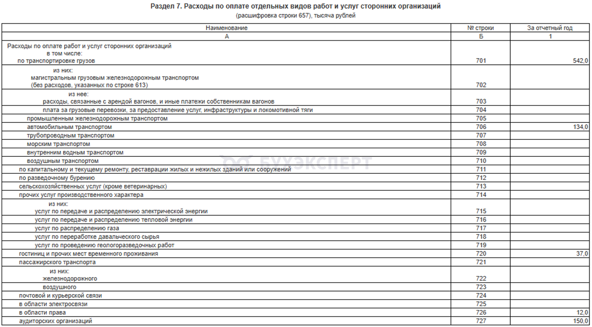 • Форма содержит 9 разделов: 1–4 и 8–9 — организационные сведения, 5–7 — финансы (оборот стр. 501, затраты 601–659, услуги сторонних фирм), заполняется в тыс. руб.