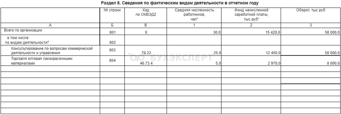 В графе 3 раздела 8 указывают оборот (выручку) организации за отчетный год без учета НДС, акцизов и иных аналогичных обязательных платежей.