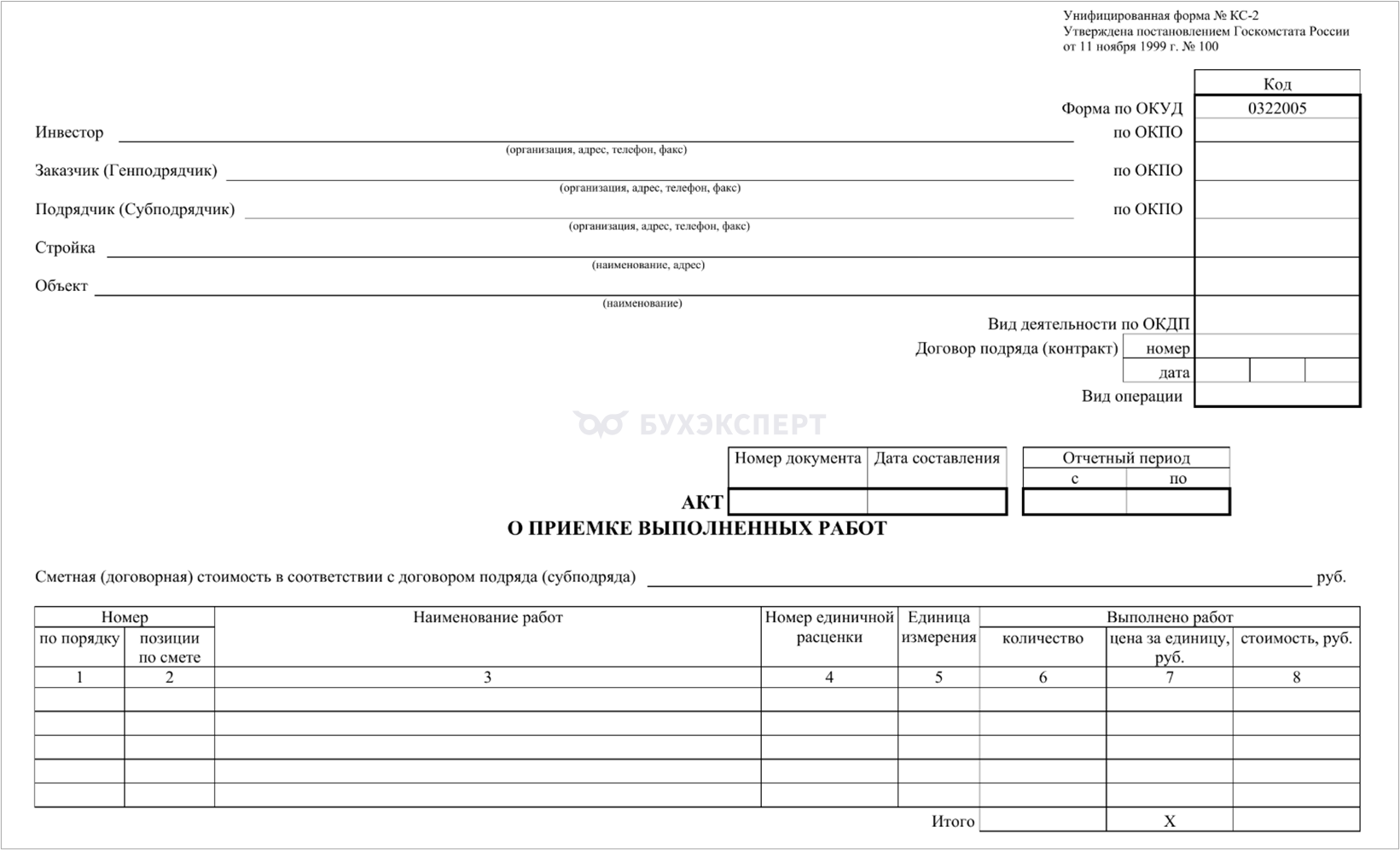 Законодательство не устанавливает единую обязательную форму акта для всех видов работ. Стороны вправе разрабатывать собственный шаблон, соблюдая требования к обязательным реквизитам первичного учетного документа.