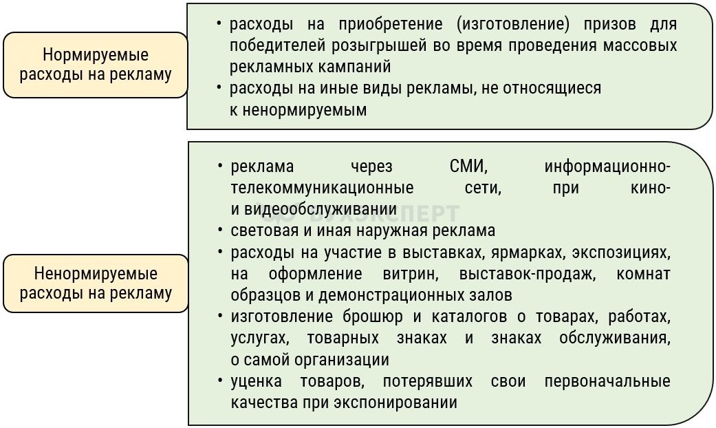 - нормируемые — это расходы, признаваемые при расчете налога в полной сумме (например, расходы на рекламу в СМИ, световую и наружную рекламу, участие в выставках и т.д.)