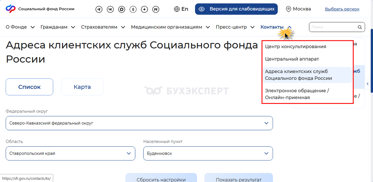 Перейти к клиентским службам (отделениям) СФР можно и из меню «Контакты» → «Адреса клиентских служб Социального фонда России».