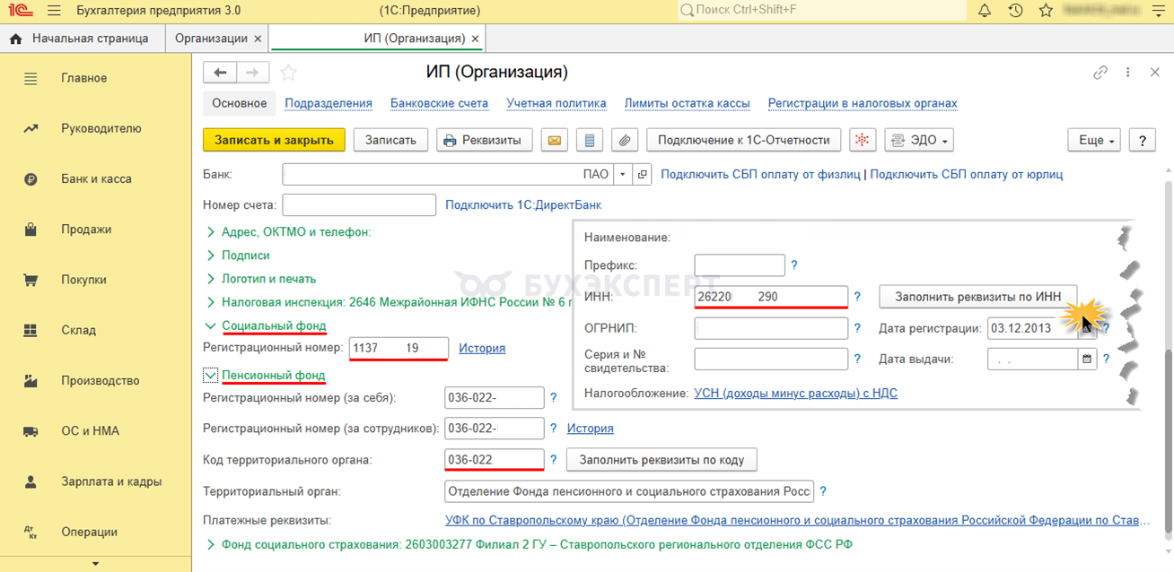 Например, в программе 1С: Бухгалтерия при подключенной интернет-поддержке автоматически заполнятся все возможные поля по нажатию кнопки Заполнить реквизиты по ИНН в карточке с реквизитами организации. В том числе Регистрационный номер в блоке Социальный фонд и Код территориального органа в блоке Пенсионный фонд.