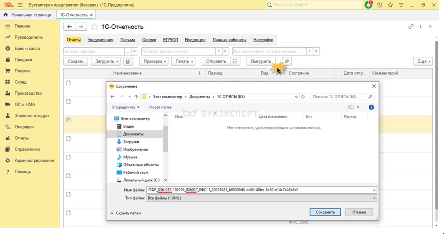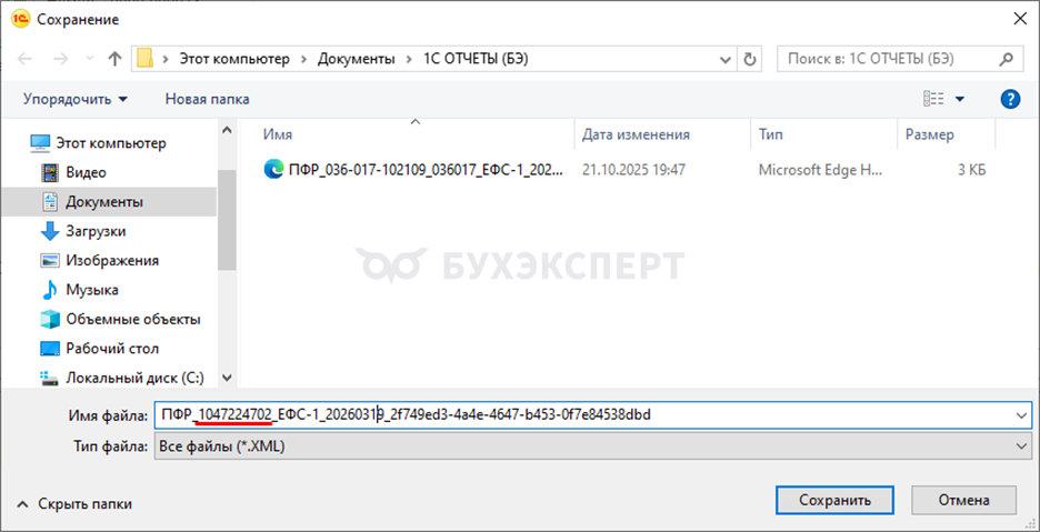 При формировании файла отчета из 1С в старом формате в его имя также включен код территориального органа СФР — в нашем примере 036-017.