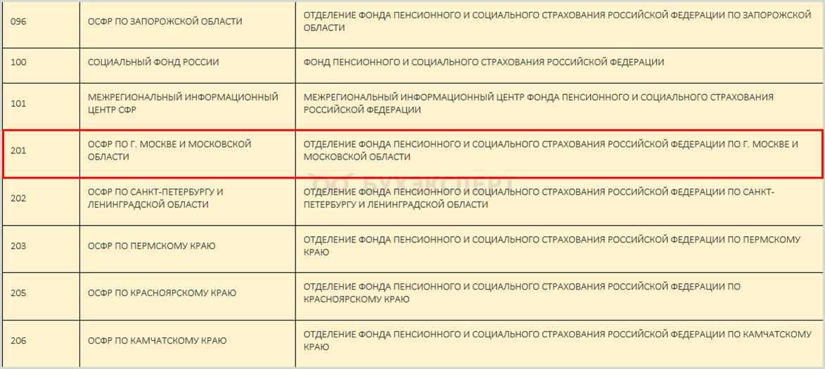 Например, код территориального органа СФР Москвы — 201 (ОСФР по Москве и Московской области).