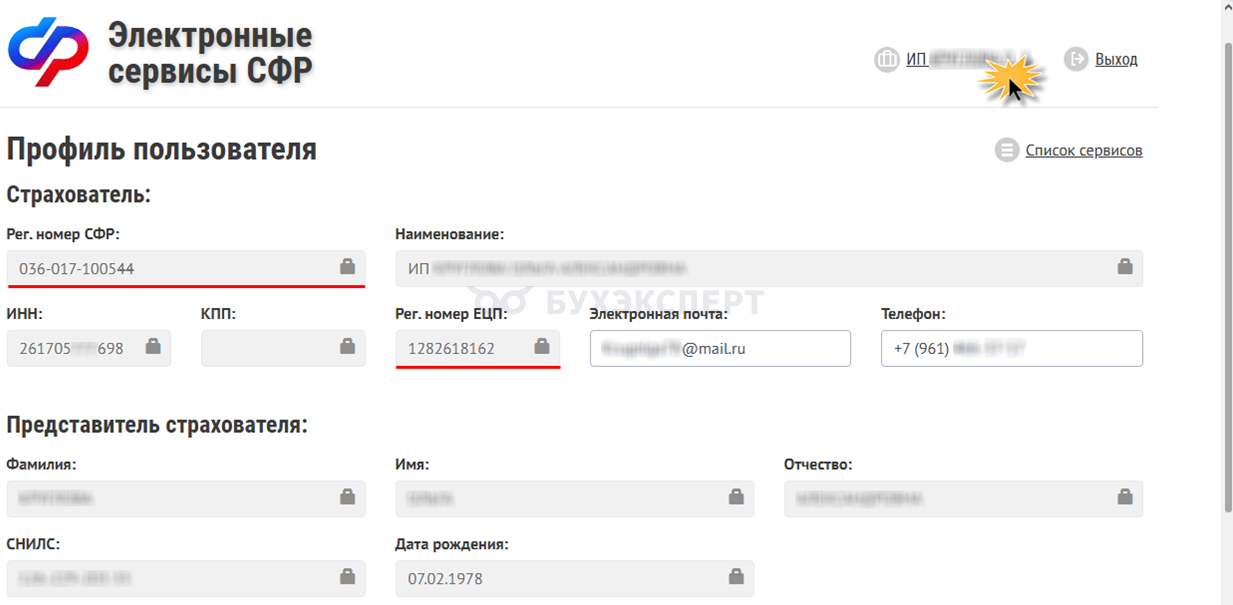 Чтобы узнать регистрационный номер в личном кабинете страхователя, перейдите на сайт СФР и откройте профиль, нажав ссылку в верхнем правом углу.