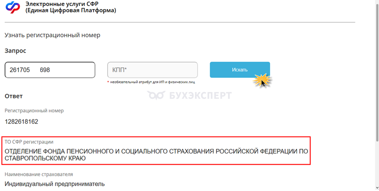 Введите ИНН и КПП (для организаций), нажмите кнопку «Искать» — сервис выдаст данные о регистрационном номере страхователя, указав его территориальное отделение (поле «ТО СФР регистрации»). Код территориального органа не указан, но его можно посмотреть по справочной таблице, как описано выше.